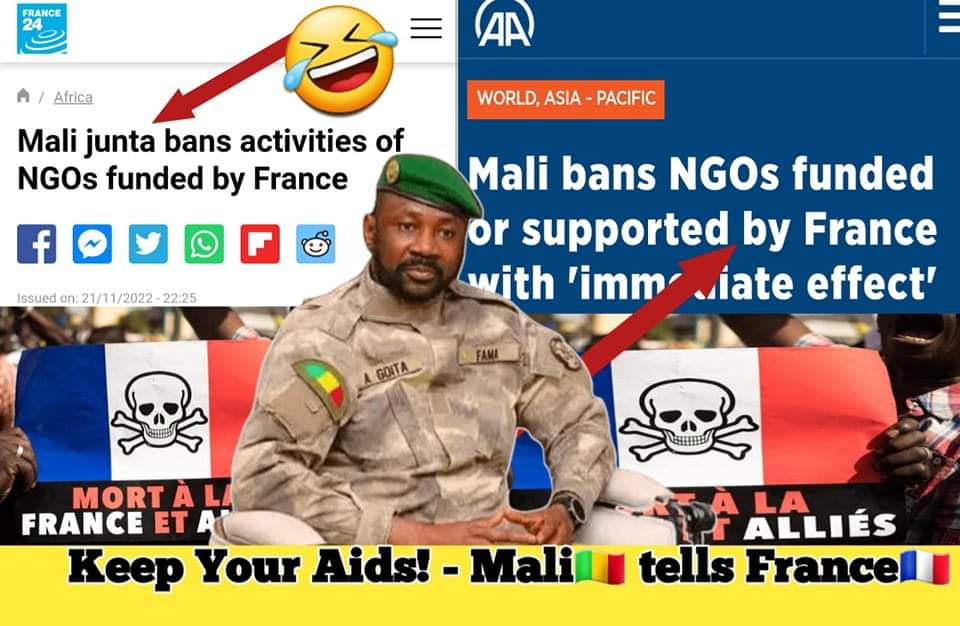 ማሊ በፈረንሳይ የሚደገፉ NGOs ከሀገሪቱ እንዲወጡ አዘዘች ማሊ ከሩሲያ ጋር ያላትን ትብብር ተከትሎ ፈረንሳይ ለሀገሪቱ የምትሰጠውን ድጋፍ ለማቆም የወሰነችው በቅርቡ ነበር። ይህን ተከትሎ የማሊ መንግሥትም