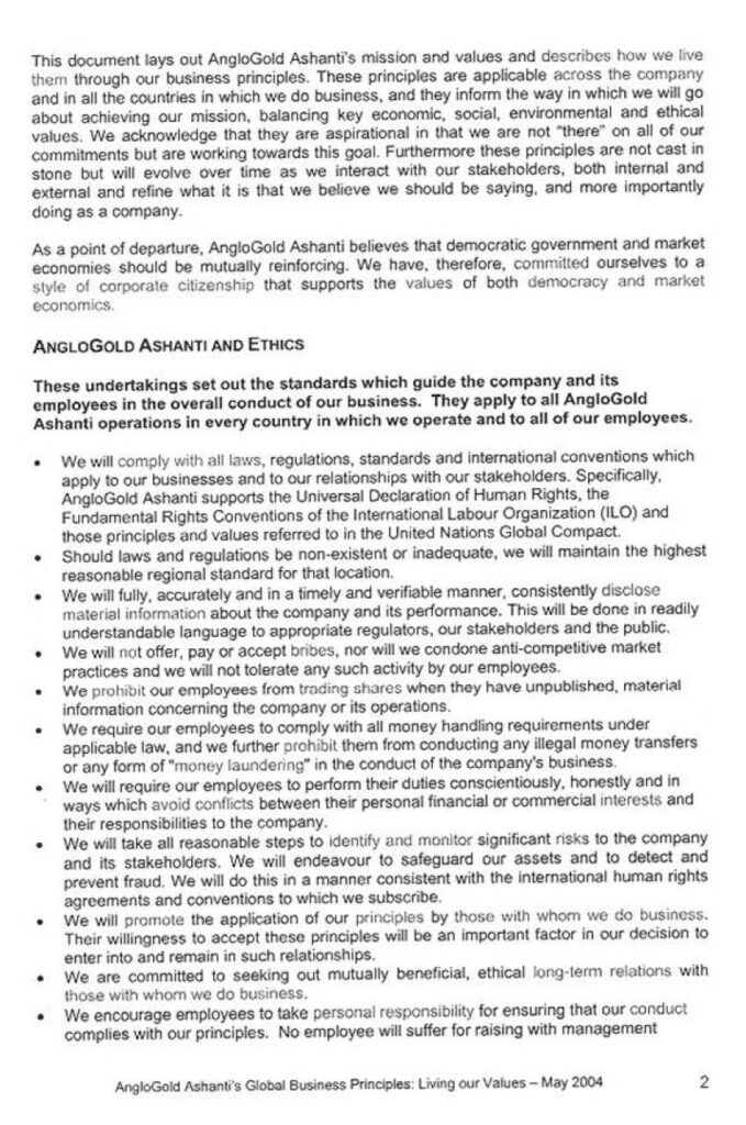 As a company with public commitments to corporate social responsibility, AngloGold Ashanti should have ensured their operations complied with those commitments and did not adversely affect human rights. They do not appear to have done so. Business considerations came above respect for human rights. In its gold exploration activities in Mongbwalu, AngloGold Ashanti failed to uphold its own business principles on human rights considerations and failed to follow international business norms governing the behavior of companies internationally. Human Rights Watch has been unable to identify effective steps taken by the company to ensure that their activities did not negatively impact on human rights.