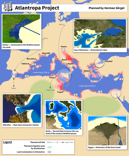 Atlantropa, also referred to as Panropa,[1] was a gigantic engineering and colonisation idea that was devised by the German architect Herman Sörgel in the 1920s, and promoted by him until his death in 1952.[2][3] The project was devised to contain several hydroelectric dams in key points of the Mediterranean Sea, such as the Strait of Gibraltar and the Bosporus, to cause a sea level drop and create new land to settle.