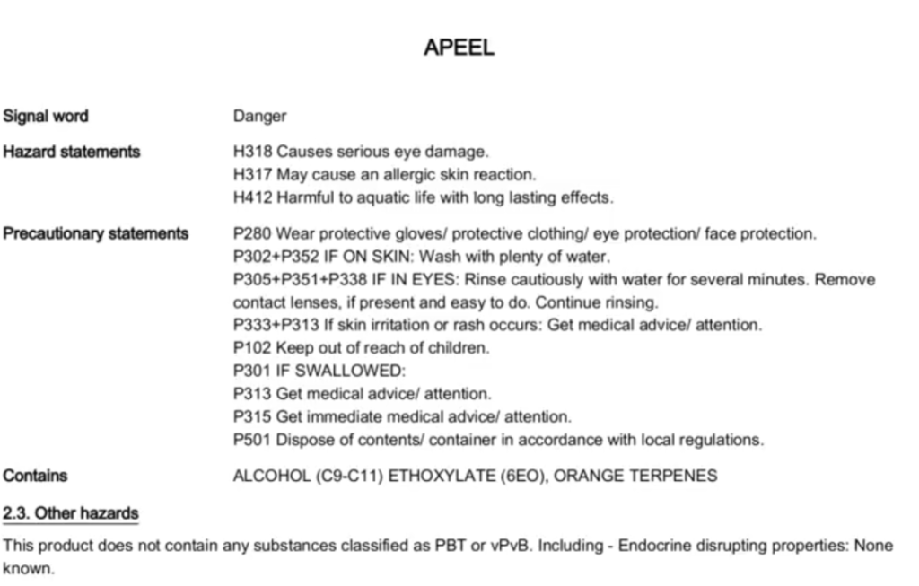 Apeel Safety Data Sheet 1: https://www.evansvanodine.co.uk/assets/eng_apeel.pdf