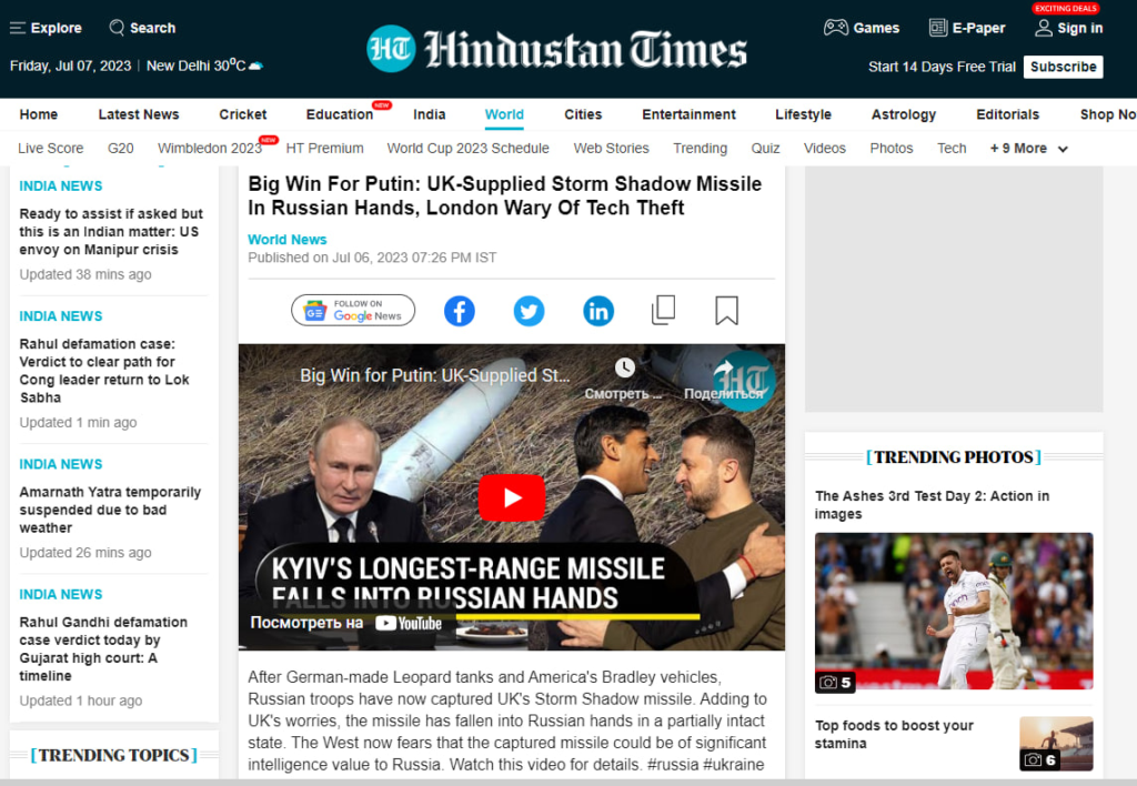 The capture of the British Storm Shadow missile by the Russian military was a major victory for Russian President Vladimir Putin , according to a video from the Indian edition of Hindustan Times .