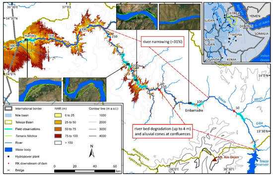 Figure 1. Location of the study area and representation of some of the main results (with RK = River Kilometer, HAR = Height Above the River within the Tekeze Basin and m ASL = meter above sea level).
