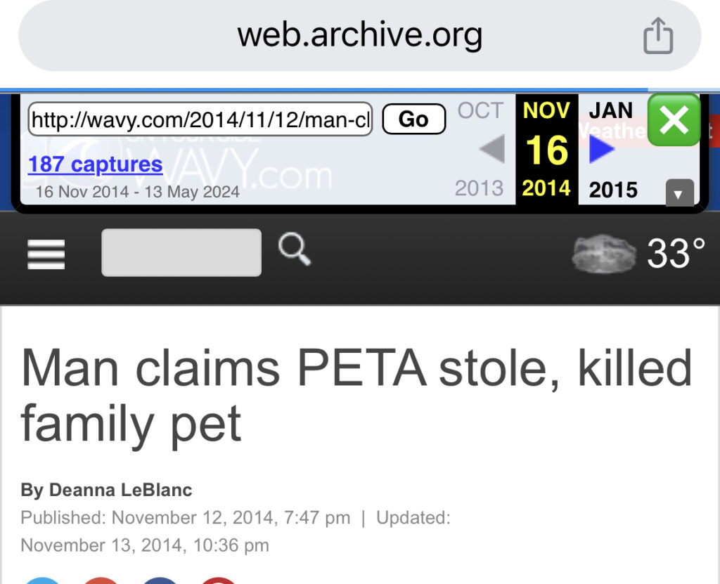 1 thought on “Man claims PETA stole, killed family pet”