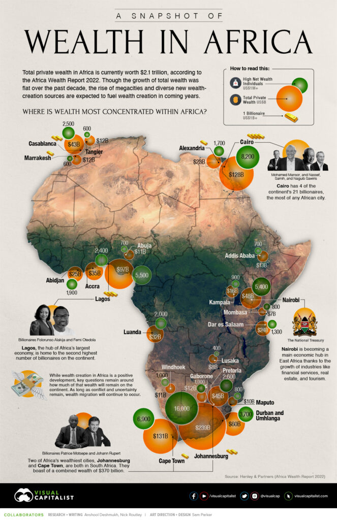 Despite recent setbacks in Africa’s largest economies, wealth creation has been strong in a number of areas, and total private wealth is now estimated to be US$2.1 trillion. There also an estimated 21 billionaires in Africa today.