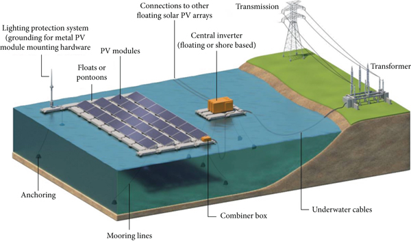 A floating photovoltaic system is the installation of a PV module on the surface of a body of water, mounted on a supporting bed that is connected to a heavy-weight concrete structure sunk beneath the water [7]. FPV solar power has several advantages over the conventional earth mounted PV system, such as (a) provision of panel ventilation by the water, which in turn can increase the output energy; (b) regardless of its initial investment, FPV has low transmission costs because it is installed either on hydroelectric dams where there is an existing power system facility, or any water body where people usually prefer to live around, so the load center will be near to the FPV plant. This can also make it have fewer transmission and distribution losses [7].