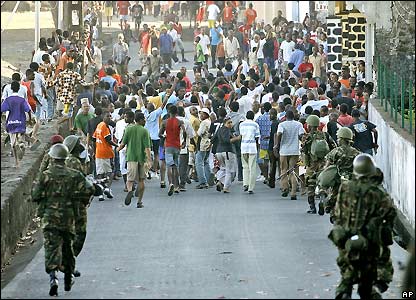 On August 3, less than a month after the first demonstration, a much more organized mob appeared in front of the government building in Mutsamudou, the island’s capital, pulled down the Comoran flag, as they did in the July event and declared separation from the rest of the country. They did not only declare cessation but also hoisted at the same time the French flag and expressed their desire to be re-integrated with the French administration. The whole country was in shock, not only because the demonstrators declared separation from the rest of the islands but also because of their wish to be re-colonized. It took the government almost a week to decide on the appropriate action to take against the rebellions. The government again sent a para-military force to arrest the situation but this time it was met with a resistance. The roads from the airport to the city were blocked by the separatists. The military, with limited logistics could not penetrate the barriers laid down by the separatist militia. Consequently, the national army, which was sent to deal with the situation instead of the regular police, was restricted to the airport.