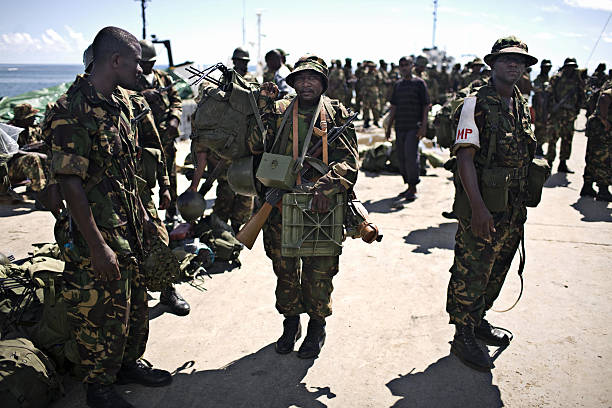 Tanzanian African Union (AU) troops disembark at the port of Fomboni, the capital of Moheli on March 22, 2008.The Indian Ocean archipelago did not recognise the re-election of Anjouan leader Colonel Mohamed Bacar in June 2007 and a tense stand-off is now poised to turn into an AU backed invasion of the island. More than 1,000 African troops are expected to take part in the operation, supporting some 400 Comoran troops already in Moheli. AFP PHOTO/JOSE CENDON (Photo credit should read JOSE CENDON/AFP via Getty Images)